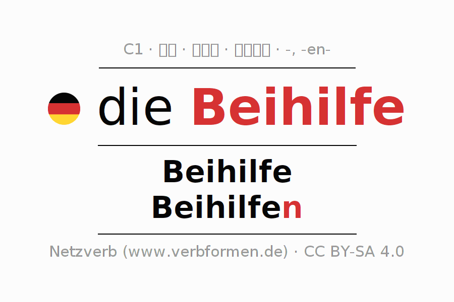 - 単数: die Beihilfe, der Beihilfe, der Beihilfe, die Beihilfe